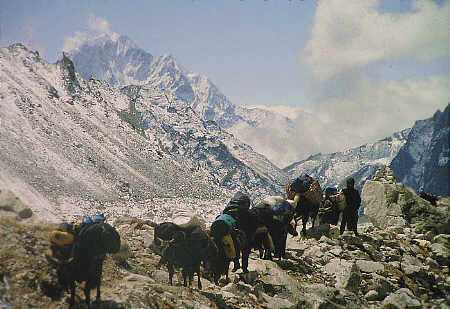 Bild 25: Die meisten Dinge werde mit Yaks hergebracht, Träger bringen aber auch frisches Gemüse in 2 Tagen von Namche Bazar ins Lager