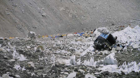 Da fast alle Everest-Expeditionen in dem ganz kleinen Zeitfenster von Mitte bis Ende Mai zum Gipfel gehen findet man ab April viele Expeditionen mit ihren Zelten vor, welches