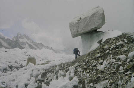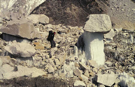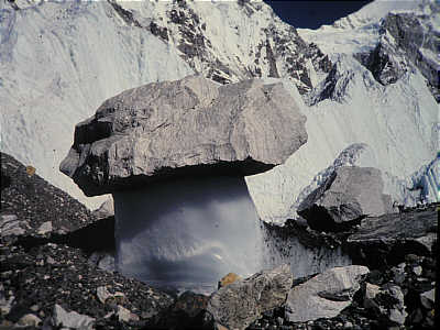 Bild 7: Da der dicke Stein vor der Sonne schützt, schmilzt unter ihm das Eis nicht weg. Hier kann man daher gut sehen, wieviel vom Eis des restlichen Gletschers schon weggeschmolzen ist.