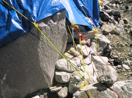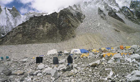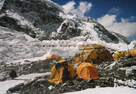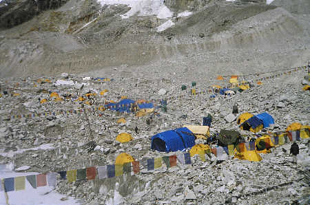 Bild 10: Im Frühjahr 2004 waren 14 Expeditionen am Base Camp. Die Base Camps liegen normalerweise immer unter 5500 m , da sich da der Körper noch halten und regenerieren