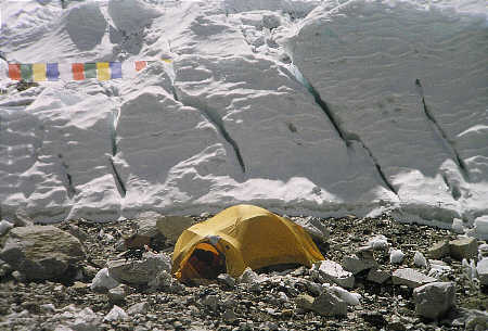 Bild 17: Ich habe am Rand des EBC mit Bachan mein kleines Zelt aufgeschlagen. Der Boden ist blankes Eis und in der Nacht ächzte und quietsche es in einem fort, so dass