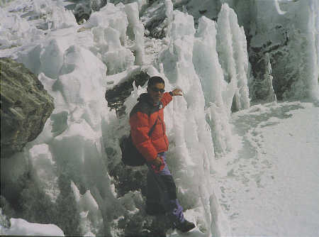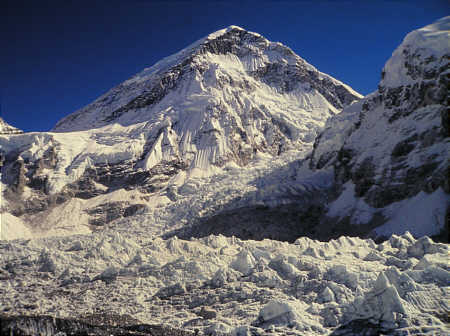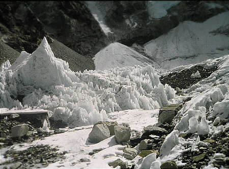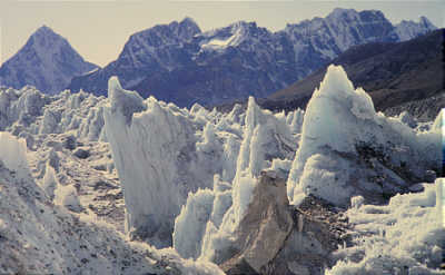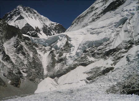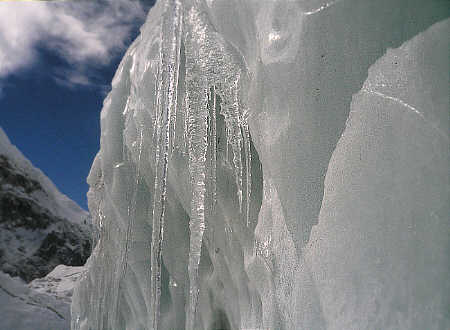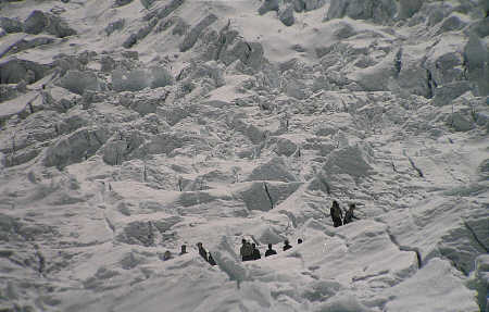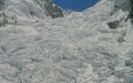 Bild 12: Der eigentliche Khumbu Eisfall stürzt sich ca. 600-800 m herab. Er ist ständig in Bewegung und eines der schwierigen Hindernisse für jede Expedition. Meistens wird