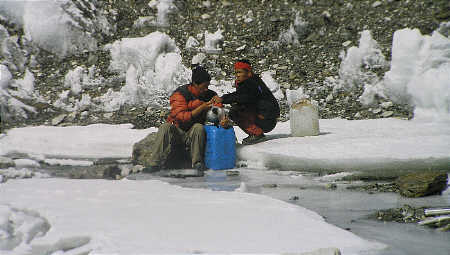 Bild 31: Alle Expeditionen vereinbaren eine Wasserstelle am Rande des Base Camps. Im ganzen Zuflussbereich wird dann von allen peinlich genau beachtet, dass das Wasser nicht verschmutzt wird.