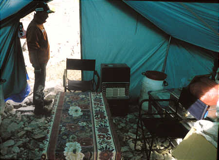 Bild 46: Pemba Sherpa und das Gemeinschaftszelt. Man beachte im Hintergrund den Petroleumofen - der schiere Luxus. Auch von Dorje Pemba Sherpa wurden wir auf einen