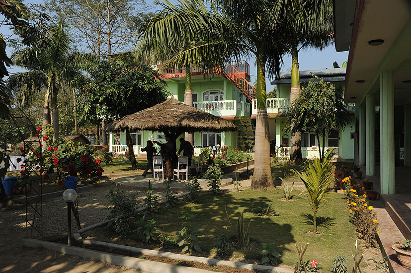 Hier finden sie auch die Tharu Lodge, die leider noch keine eigene Webseite hat. In einen Garten, sind viele kleine Häuschen im Tharustil mit Lehmwänden gebaut. es gibt