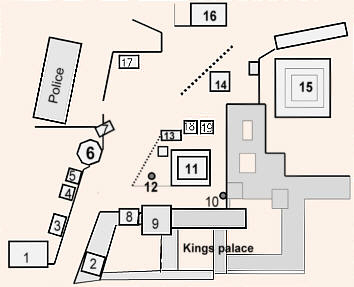 weissen Gebäude im Hintergrund gehören alle zum Komplex des Königspalastes. Sehr gut kann man auch rechts die dreistöckige Degu Taleju Pagode (9) erkennen, die in den Königspalast integriert ist und die auch