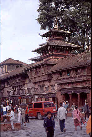 Links sieht man die Stufen des achteckigen KrishnasTempels(6). Rechts geht der schmale Platz zum Eingang des Palastes, er heißt nach dem Affengott Hanuman Dhoka(10). Im vordergrund sieht man die
