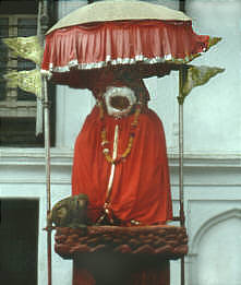 normalerweise hinter einem großen Gitter verborgen. nur zu bestimmten Festen wird das Gitter geöffnet und die Maske mit Blumen geschmückt. In seinen Mund mit den fürchterlichen Reißzähnen wird ein Rohr gesteckt,