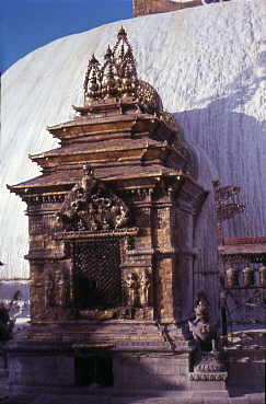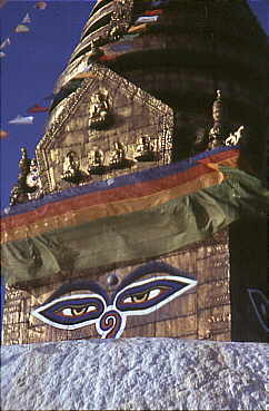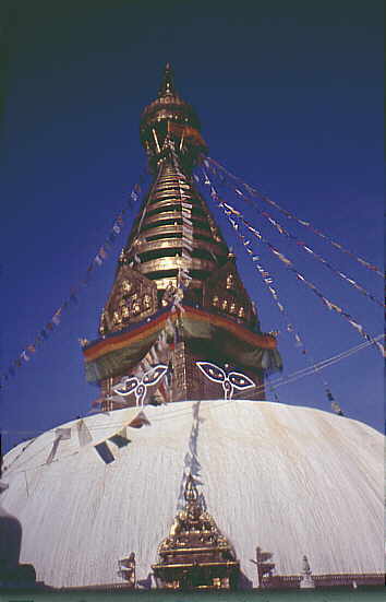 Über der weissen Halbkugel ist ein vergolteter Würfel mit den Augen des Buddhas, die in alle vier Himelsrichtungen schauen und so das ganze Tal sehen können. Die “Nase” ist in