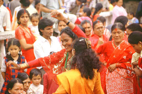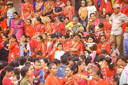 Die Frauen ziehen ihre schönsten roten Saris an wenn sie in Kathmandu zum Fest gehen.
