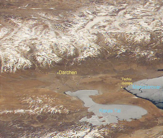 Auf diesem Bild sind die beiden Seen zugefroren. Der See rechts ist der Manasarovar See und ist symbol für die Sonne und die hellen Kräfte. Rakas Tal ist mit seiner Mondsichelform dagegen Symbol