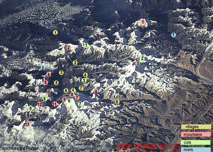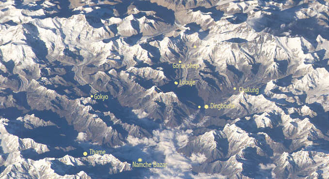 Credit "Image courtesy of Earth Sciences and Image Analysis Laboratory, NASA Johnson Space Center." See http://eol.jsc.nasa.gov, Part of picture ISS008-E-6343, Adaption Andrées de Ruiter www.nepal-dia.de Sehr gur kann man hier links oben am Ende des Gokyotales den Cho Oyu sehen