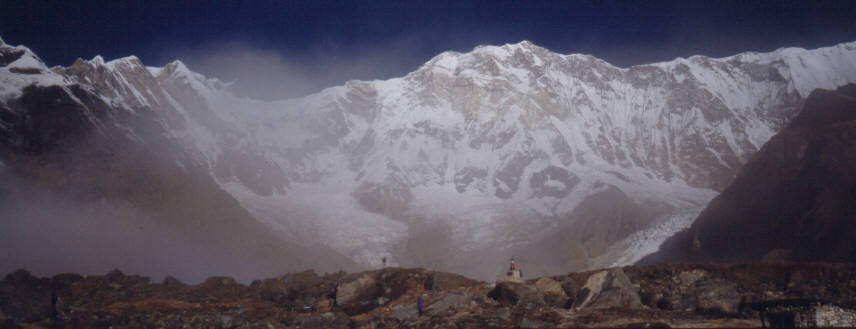 Die fast 4000 hohe senkrechte Wand Südwand der Annapurna 1. im Vordergrung sieht man den Gedenkstein an