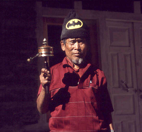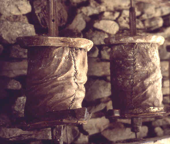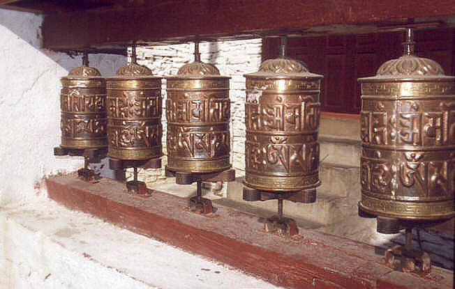 Die tragbaren kleinen Gebetsmühlen werden noch immer von vielen Leuten mitgenommen und durch eine leichte Handbewegung zum Drehen gebracht. So kann man die gute Tat