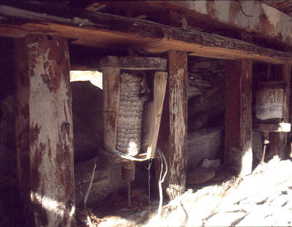 Gebetsmühle in der Nähe von Pisang. Der grob gezimmerte Holzbehälter schützt die Gebetsseiten