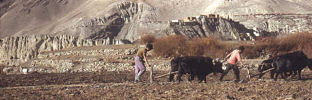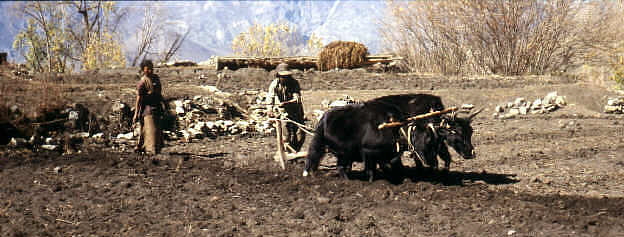 Meist werden zwei Ochsen vor den einfachen Hakenpflug gespannt. Hinter dem Pflüger wird direkt die Saat in die Furche gesäht.
