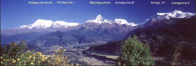 Vom Aussichtshügel Sarangkot im Norden von Pokhara hat man eine sehr schöne Sicht auf das ganze Annapurnamassif. Besonders schön ist es, wenn man zum