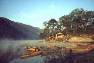 Wenn man sich ein Böotchen mietet, hat man großartige Ausblicke auf Pokhara und das ganze Annapurnamassif