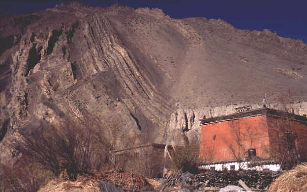 Hinter dem Kloster erkennt man die gefalteten Sedimentgesteine . Hier war früher Meeresboden und man findet heute auf 4000 m Fossilien!