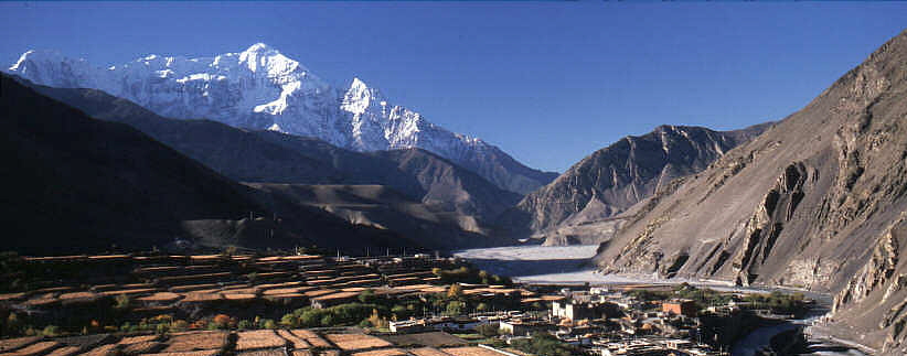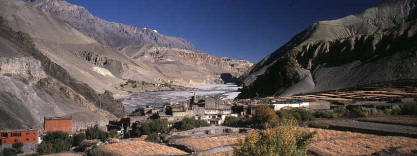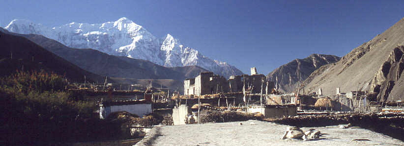 Blick von der anderen Seite des Ufers auf Kagbeni und den Thorong La