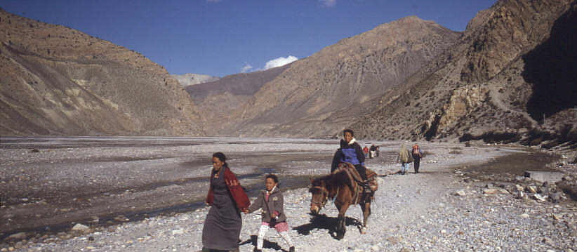 Von Kagbeni nach Jomsom läuft der Weg im trocken Tal des Kali Gandaki entlang. In den Wintermonaten führt dieser recht wenig Wasser