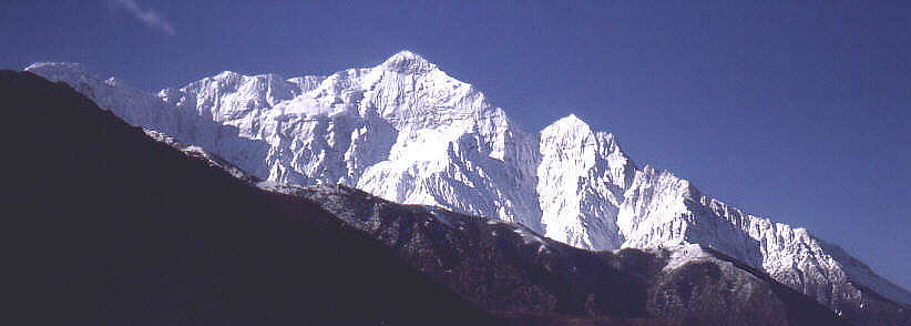 Hinter dem hohen Gipfel Nilgiri north in der Mitte des Bildes liegen , hier nicht sichtbar, noch der Mittel- und Südgipfel. Der kleinere Zacken rechts hat wie viele andere 6000 Gipfel in Nepal nicht mal einen Namen.