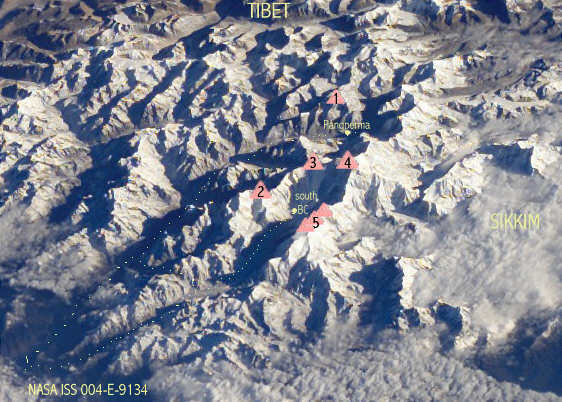 1 Drohma peak 6850, 2 Kumbhakama 7719 m, 3 Kambachan 7902 m, 4 Kangchenjunga 8586 m, 5 Kabru 1-3 7353 m. The northern base camp is near Pangperma.