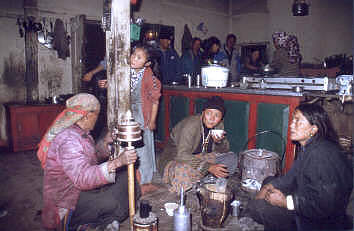 In den oberen Regionen , hier in Kagbeni, sitzen die Leute stundenlang zusammen, plaudern, drehen ihre Gebetsmühlen und trinken dabei literweise Buttertee